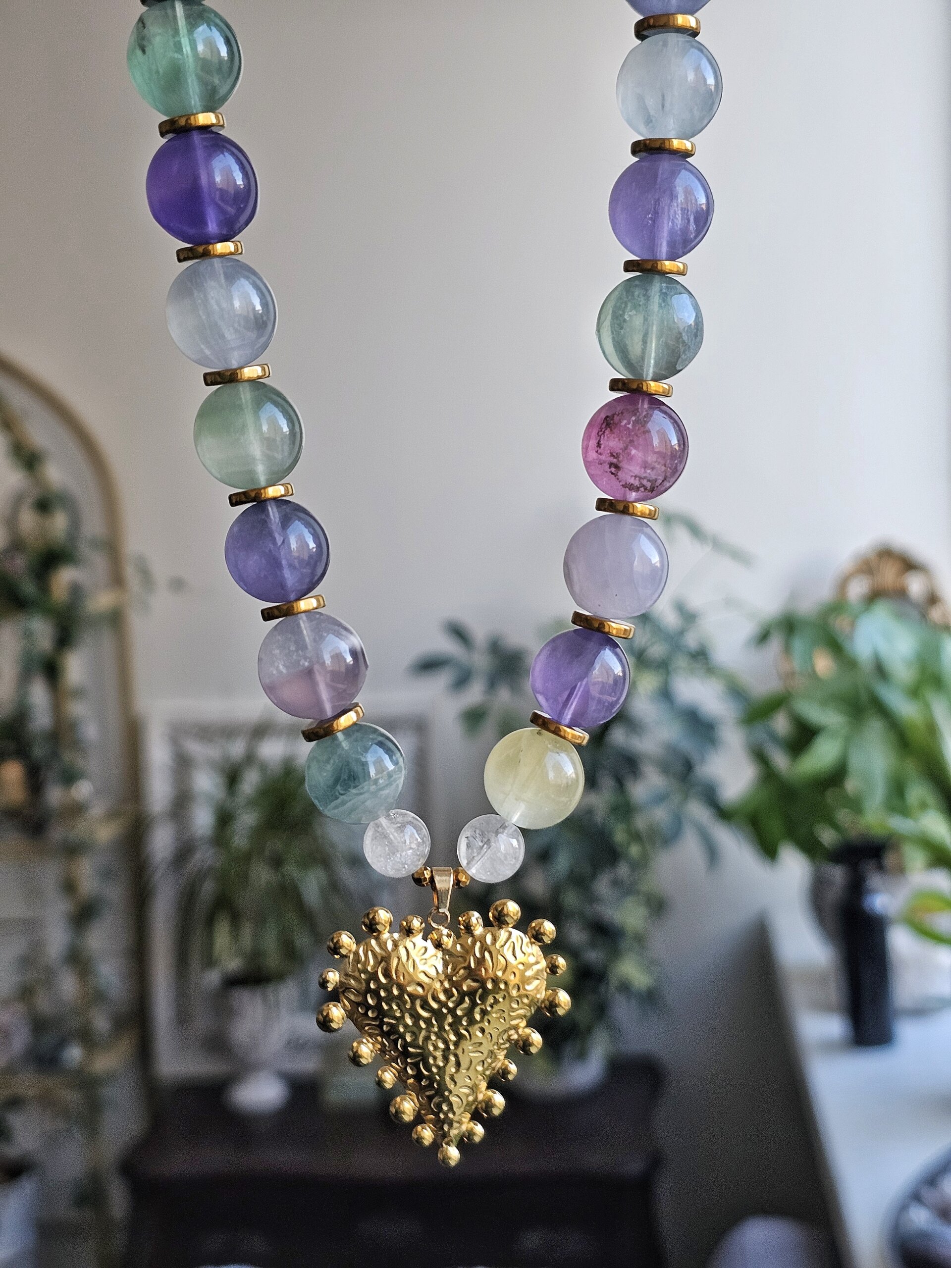 Perlai, ametistas, fluoritas, rožinis ir žemuoginis kvarcas, kalnų krištolas. Suverta ant siūlo su mazgeliais. Paauksuotas varis.