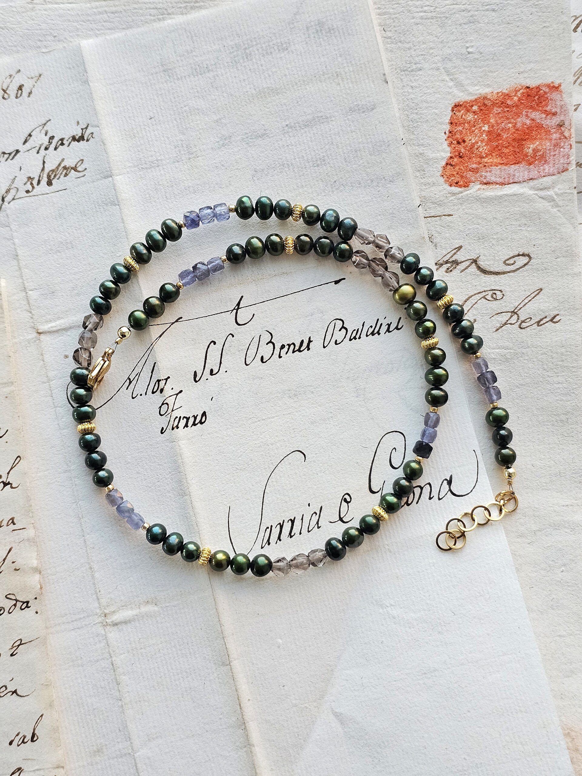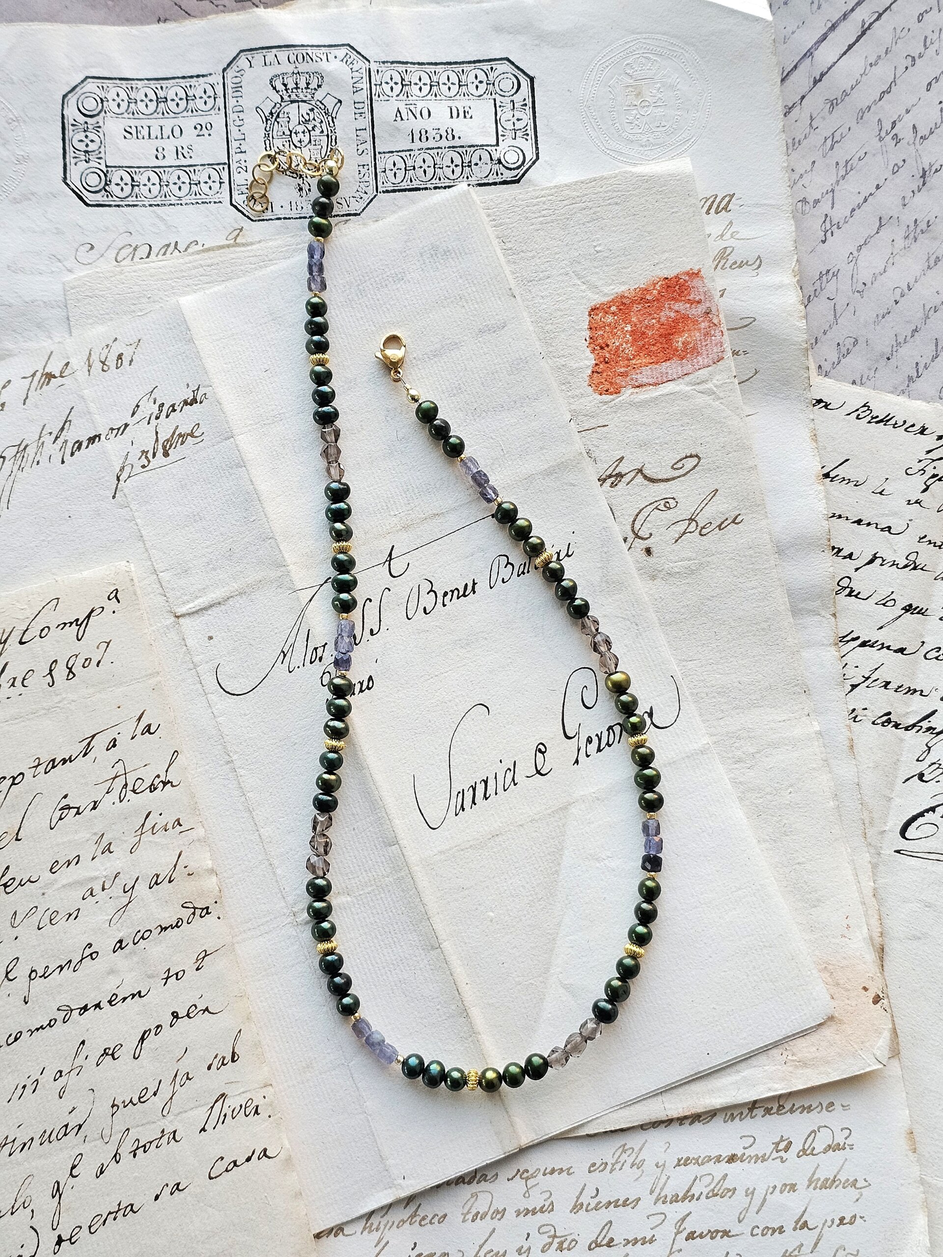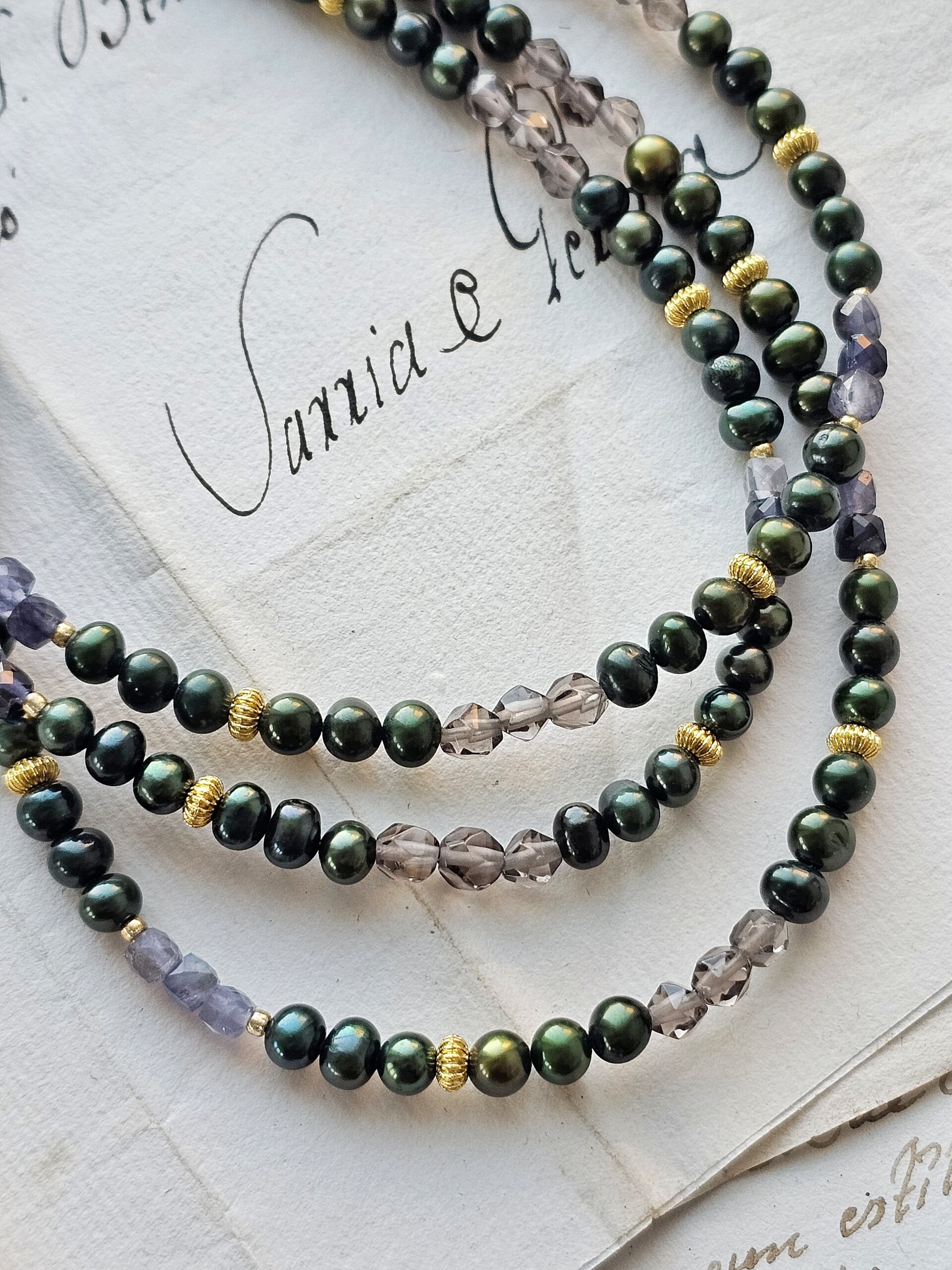 Perlai, jolitas ir dūminis kvarcas. Ilgis 48-52 cm.