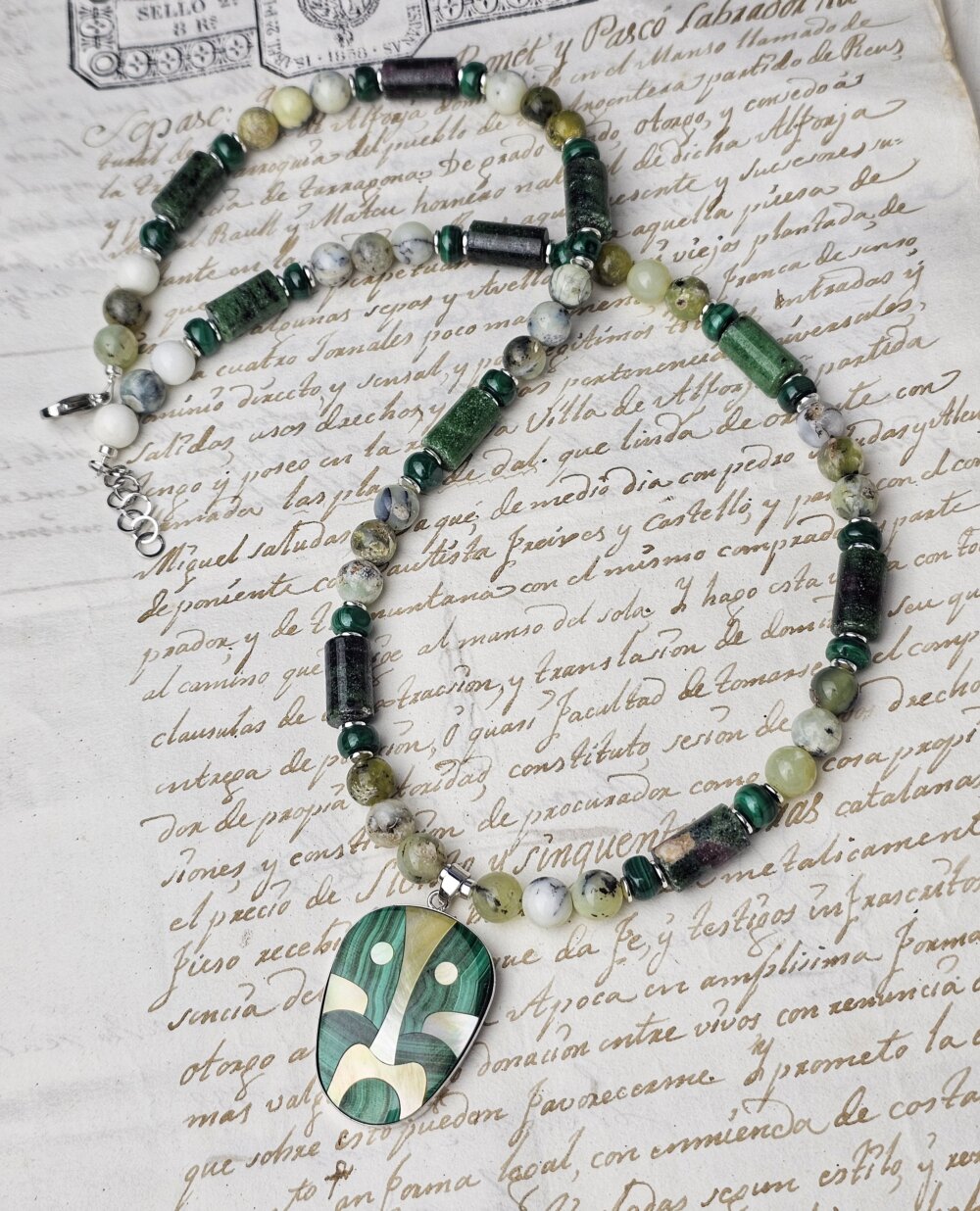 Vėrinys iš malachito, coizito, dendritinio opalo ir kriauklės
